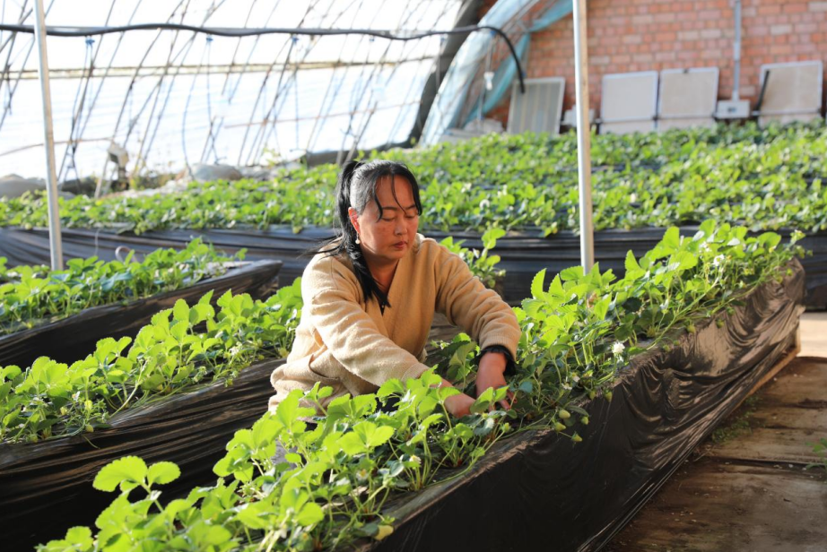 晶晶草莓園內負責人陳晶在檢查草莓生長狀態(tài)。(攝影:王蘇日古嘎)