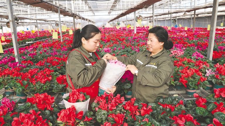 1月23日,工作人員正忙著打包花卉。通遼市慶云農(nóng)業(yè)科技有限公司花卉種植基地內(nèi),5萬盆精品大規(guī)格仙客來迎來盛花期,不僅吸引了市民和游客前來打卡觀賞,還將在新春佳節(jié)到來之際,銷往東北、華北等周邊地區(qū)的花卉市場。草原云·正北方網(wǎng)記者 鮑慶勝 攝