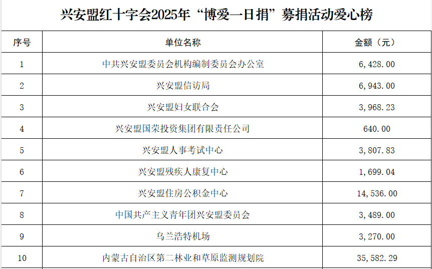 2025年,興安盟各黨政機關(guān)、企事業(yè)單位廣大黨員干部職工和各界愛心人士積極響應(yīng)興安盟行政公署關(guān)于開展“博愛一日捐”活動的號召,踴躍參與,捐出一日收入,奉獻一份愛心。截至2025年12月31日,共收到捐款142筆,合計2287643.52元。