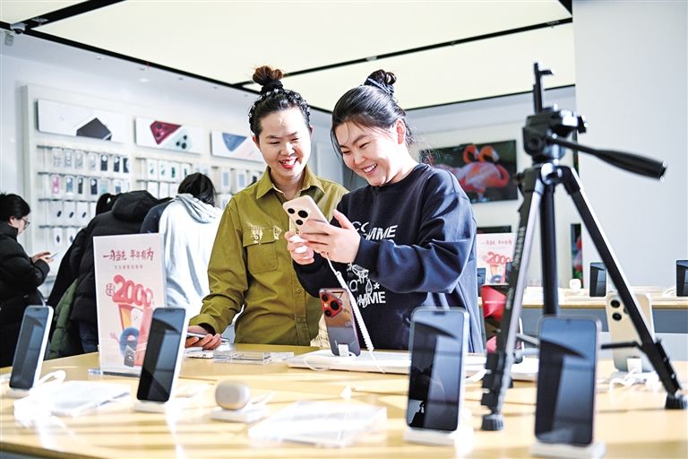 1月28日,呼和浩特市民在七彩城購物中心選購手機(jī)。春節(jié)將至,呼和浩特家電市場迎來消費(fèi)“開門紅”。自治區(qū)2026年家電以舊換新、數(shù)碼及智能產(chǎn)品購新補(bǔ)貼政策實(shí)施以來,家電及數(shù)碼市場迎來全方位熱銷態(tài)勢。 草原云·正北方網(wǎng)記者 王磊 攝